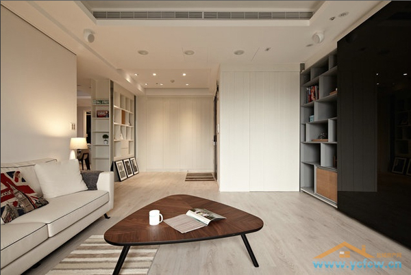 一走进室内,一整面白色收纳柜映入眼帘,部分镂空的设计有效减轻量体感,一旁更有结合书柜和电视墙的设计,上面摆放了书籍和屋主收藏的单品,充分展现屋主品味,客厅大片落地窗外,是都市中少有的阳台,阳台摆上绿色植栽,将自然绿意引进屋内。走进餐厅,深色的灯饰和浅色系餐椅、木地板相映成趣,挂在墙上的舞台剧海报让餐厅也具文艺气息。主卧内,浅色系基调搭配造型简洁的家具,让人在里面彻底放松;儿童房则不做多余设计,仅在墙上装饰可爱的动物图案,让孩子有个快乐、完整的空间。