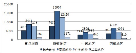 2014年第二季度,全国重点城市中,地价水平呈东高、西次、中低的布局。东部地区平均地价高于全国和中西部地区,西部与中部地区平均地价均低于全国重点城市平均水平。